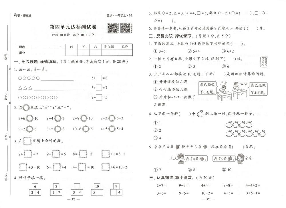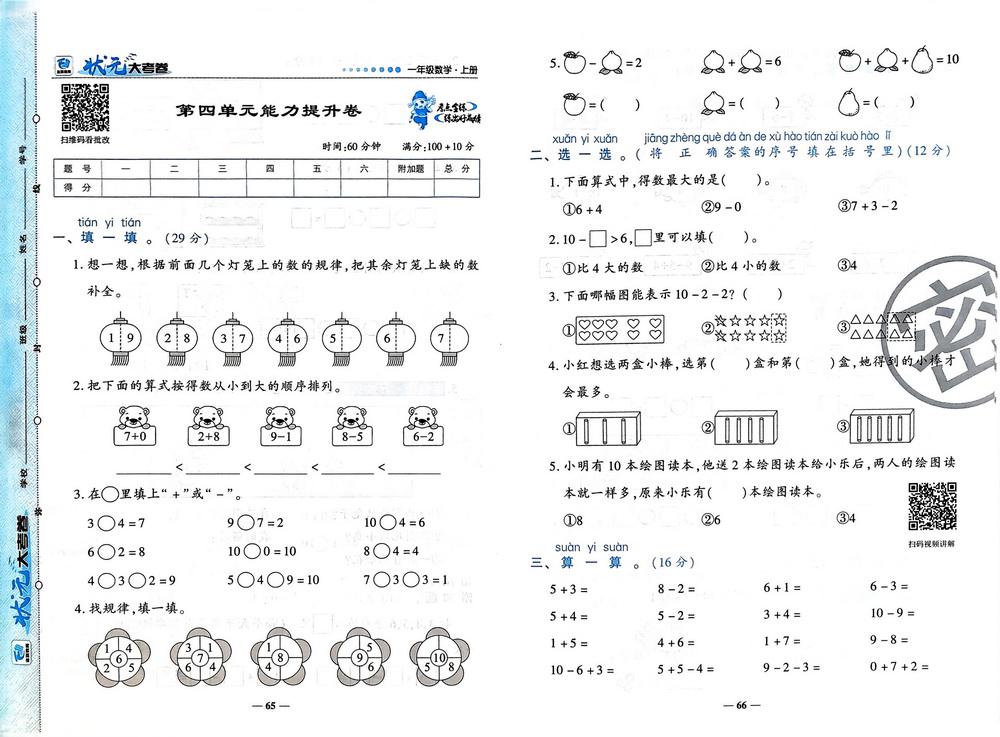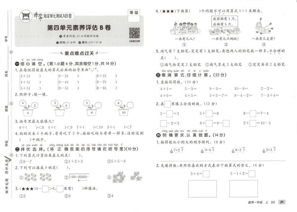 新教材北师版一年级数学上册第五单元测试卷四video
