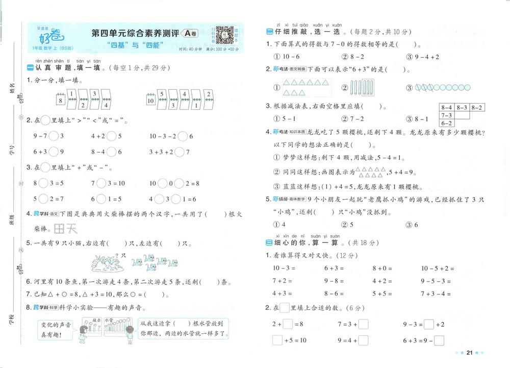新教材北师版一年级数学上册期中测试卷二十一video