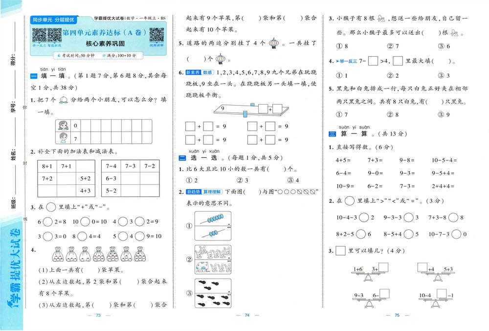 新教材北师版一年级数学上册第四单元测试卷十二video
