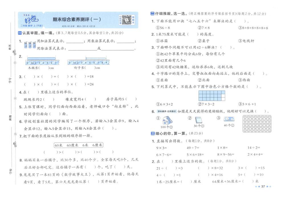 新教材人教版二年级数学上册期末测试卷三