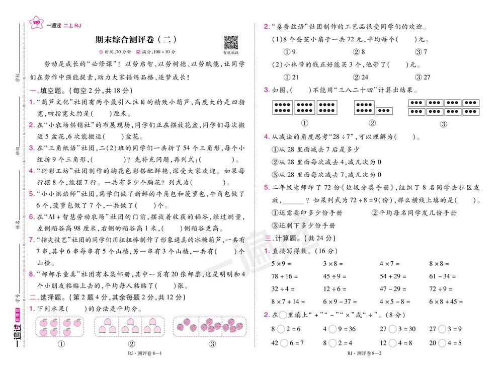新教材人教版二年级数学上册期末测试卷六