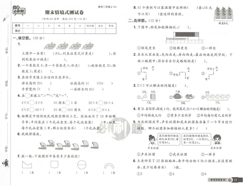 新教材人教版二年级数学上册期末测试卷二十一