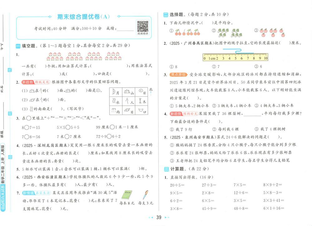 新教材人教版二年级数学上册期末测试卷二十二