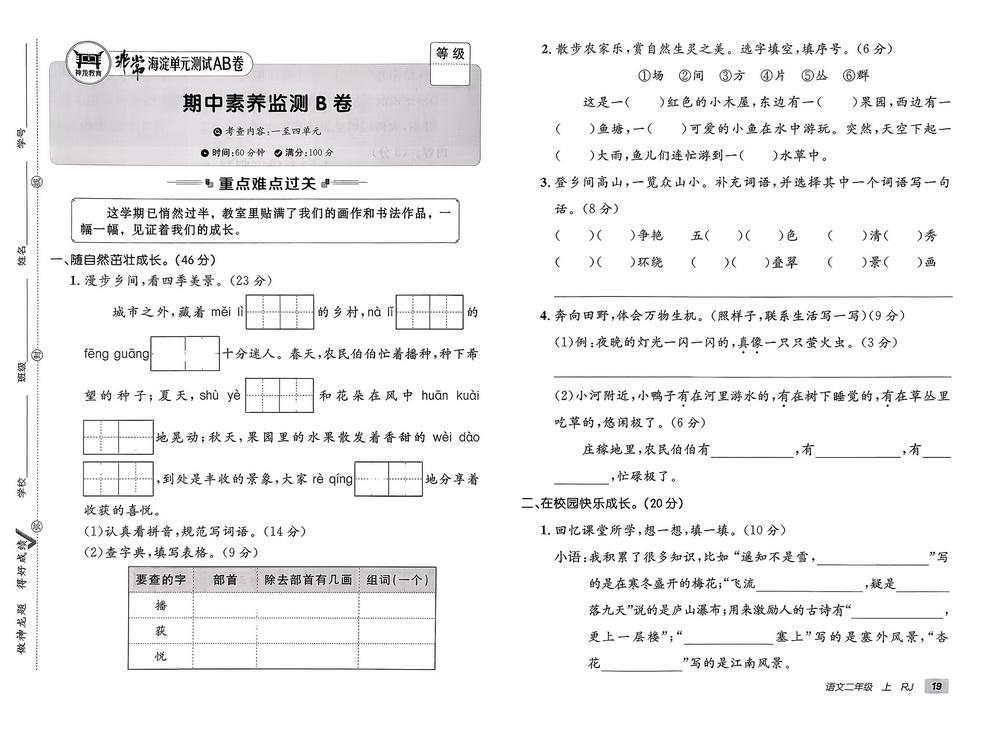 新教材人教版二年级上册语文期中测试卷二十八