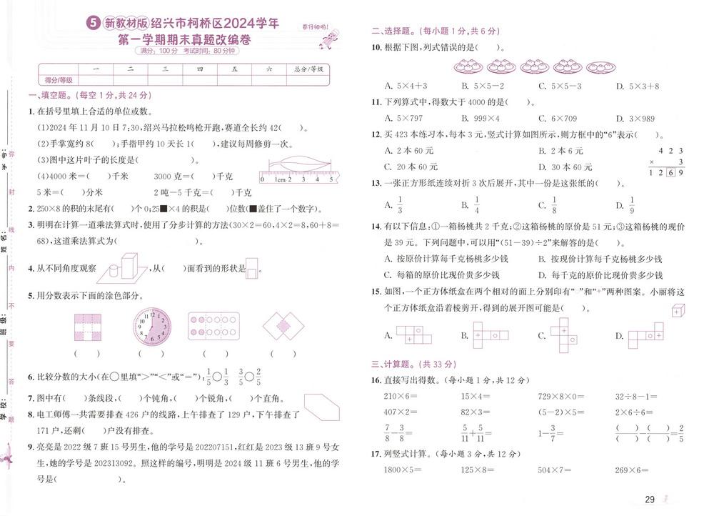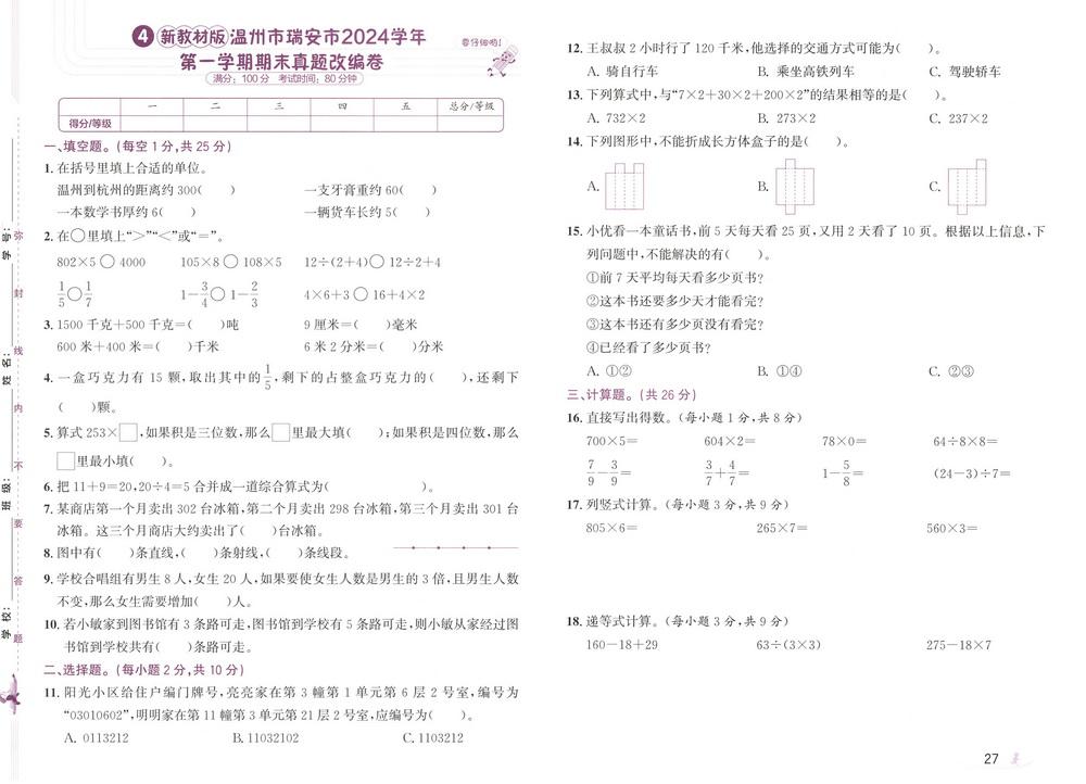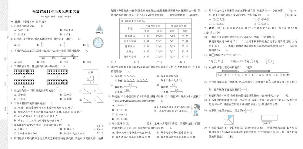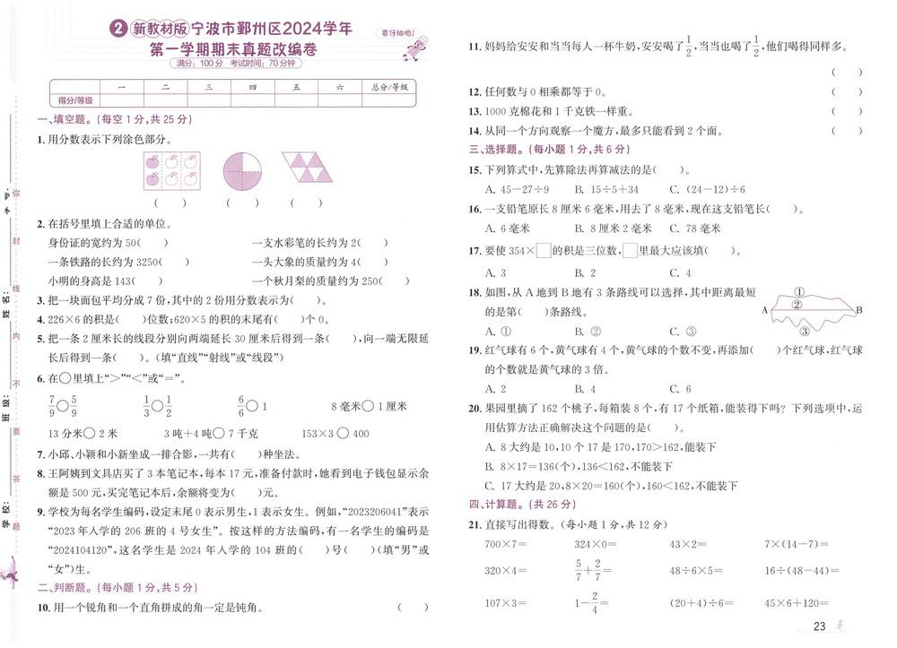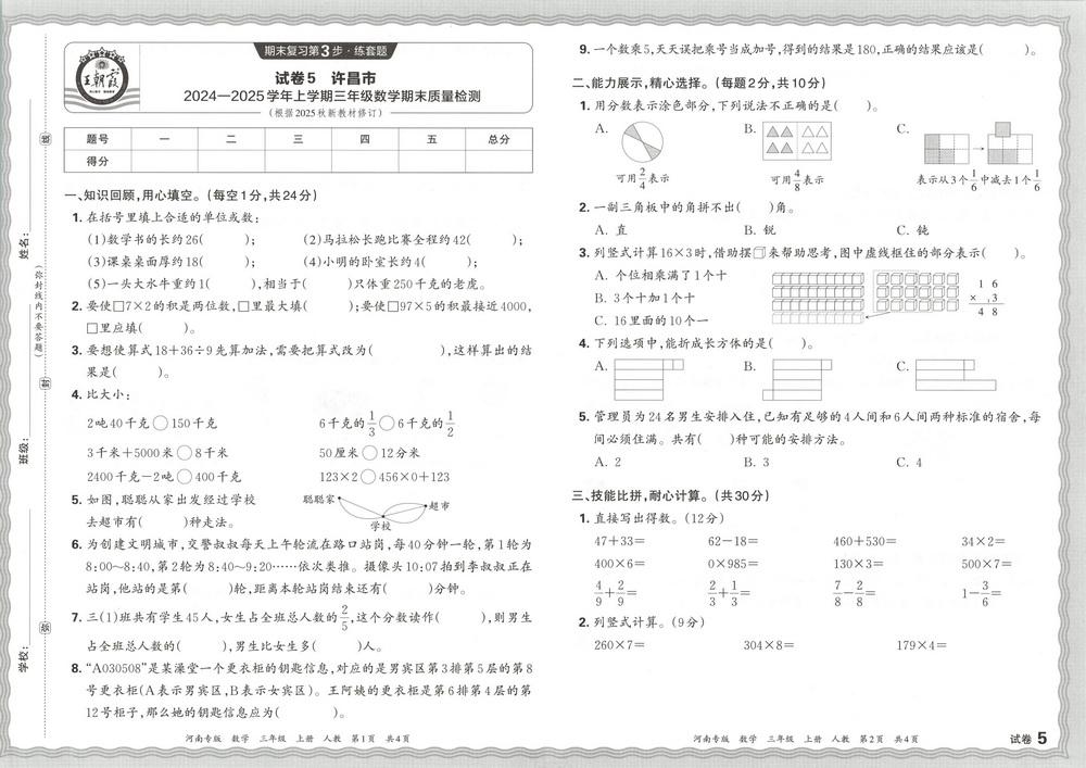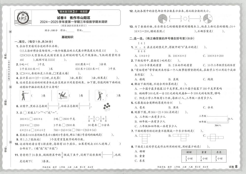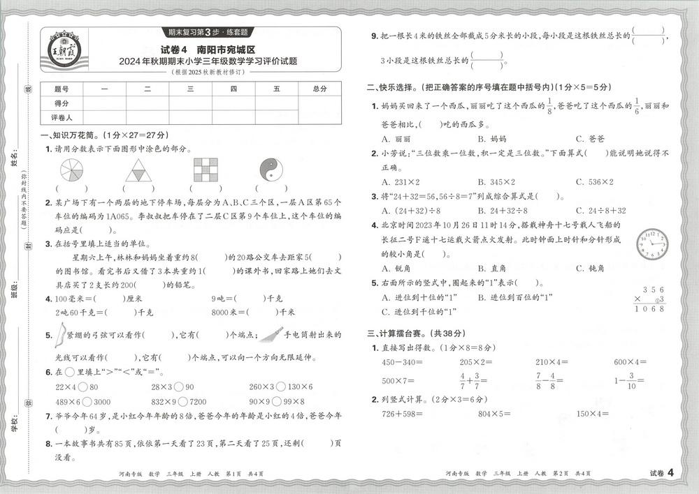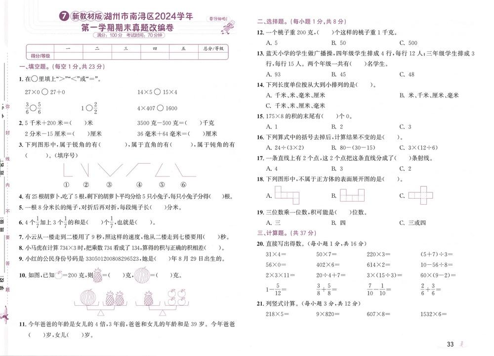 新教材人教版三年级上册数学全国省市各地期末真题试卷四十三video
