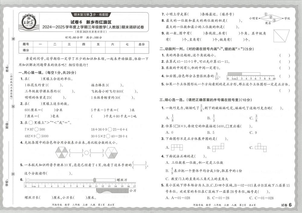 新教材人教版三年级上册数学全国省市各地期末真题试卷四十一video