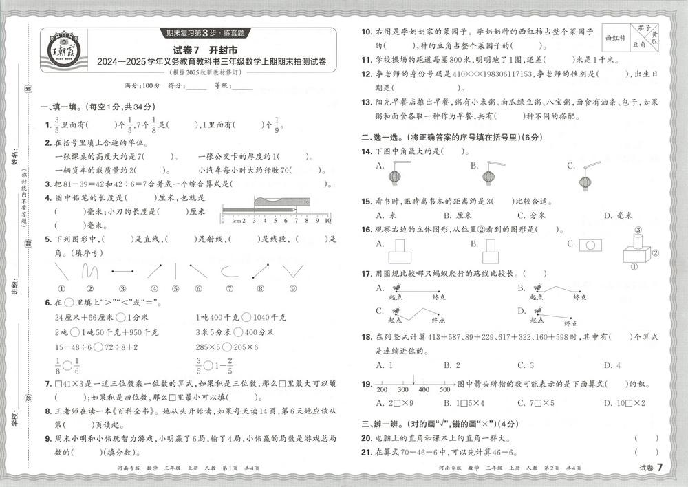新教材人教版三年级上册数学全国省市各地期末真题试卷三十四video