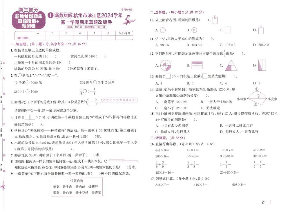新教材人教版三年级上册数学全国省市各地期末真题试卷五十一video