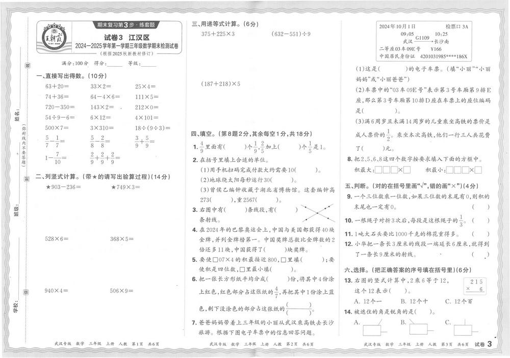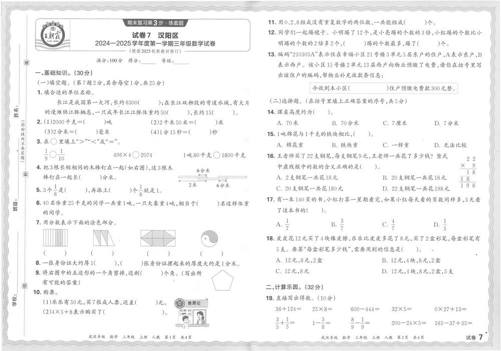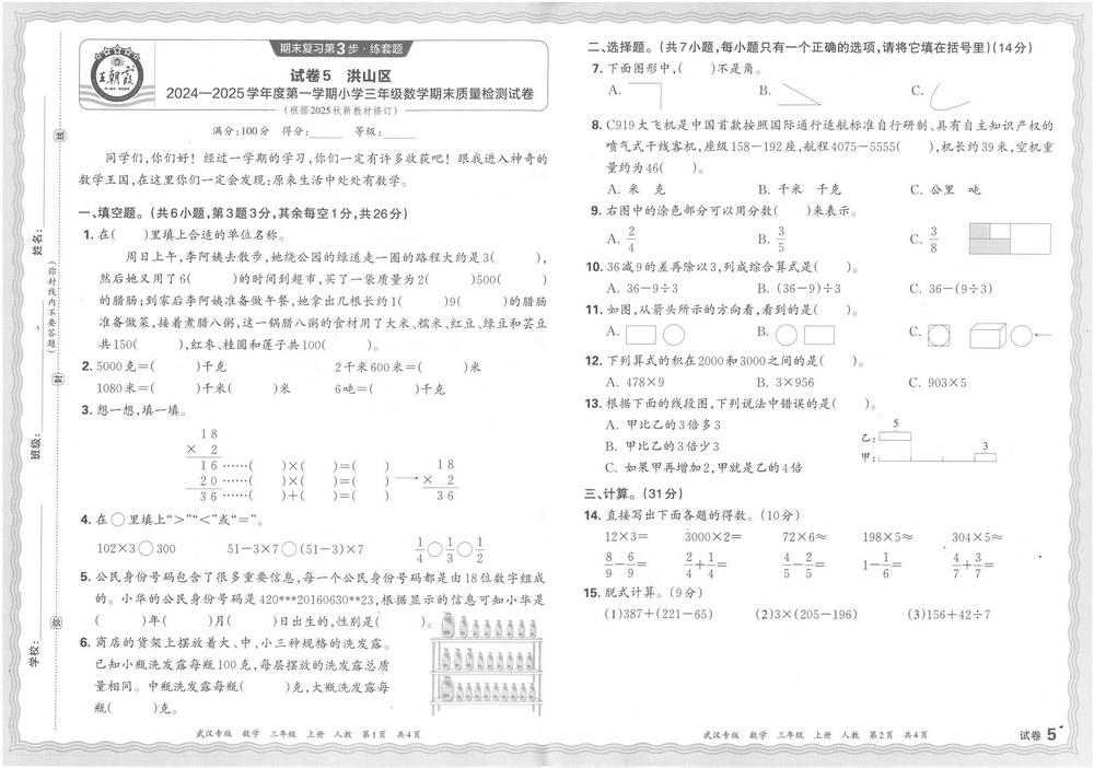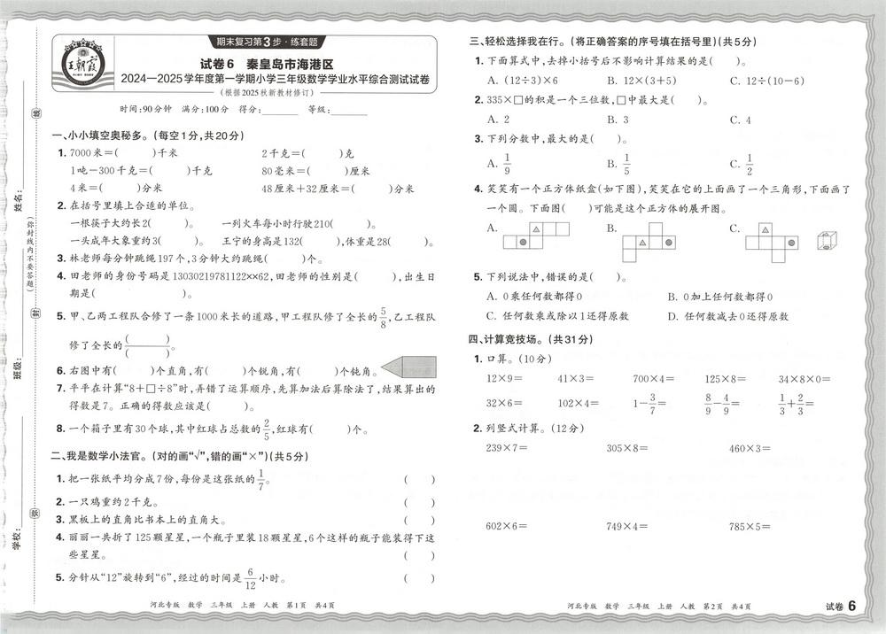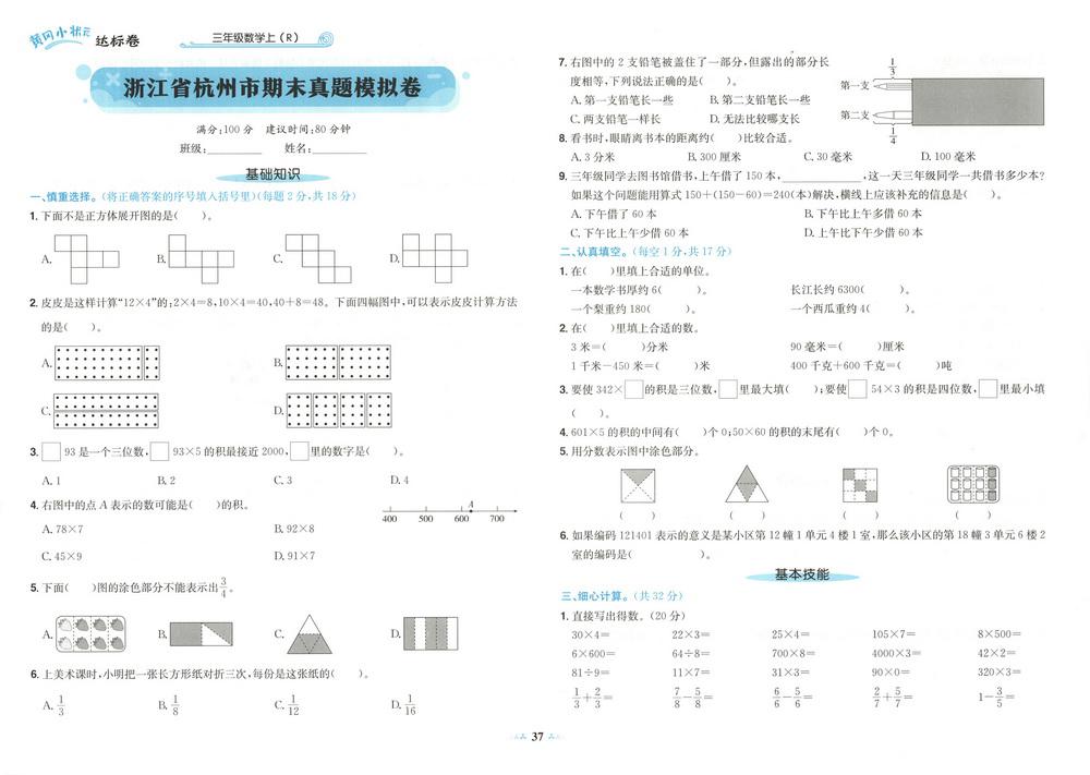 新教材人教版三年级上册数学全国省市各地期末真题试卷三十一video