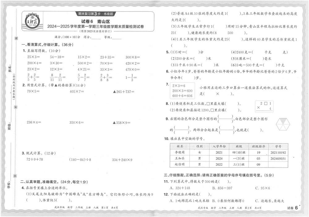 新教材人教版三年级上册数学全国省市各地期末真题试卷二十四video