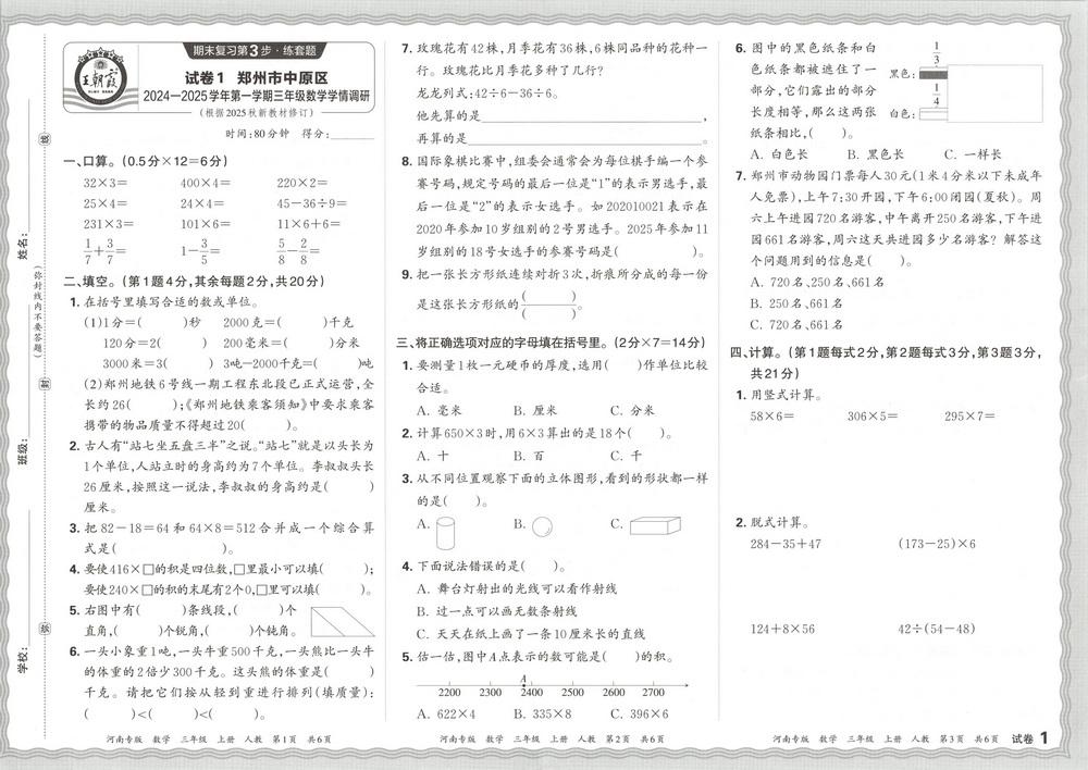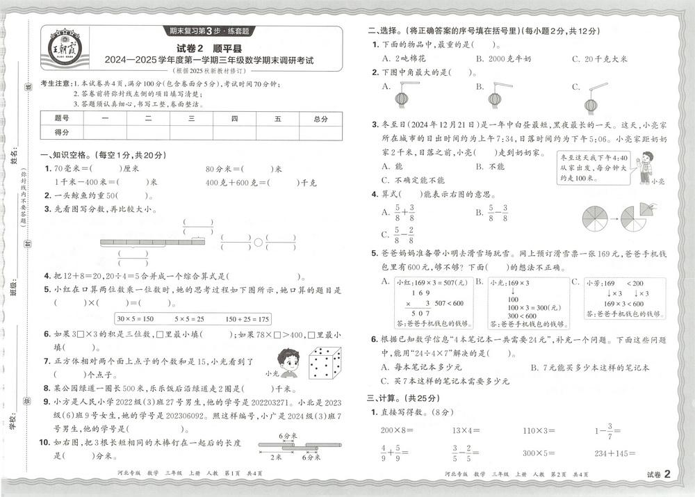 新教材人教版三年级上册数学全国省市各地期末真题试卷二十五video