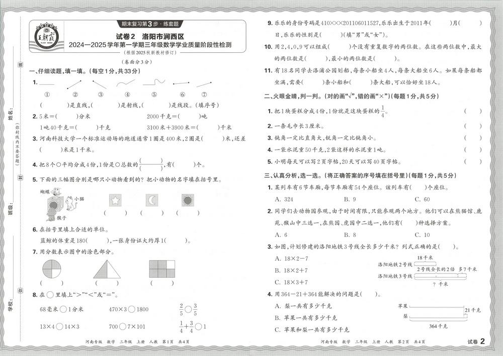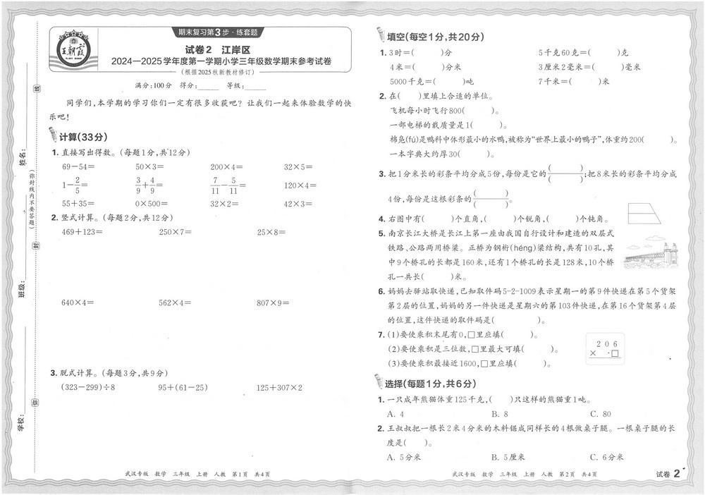 新教材人教版三年级上册数学全国省市各地期末真题试卷三十三video