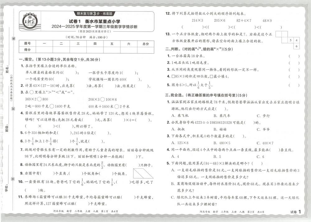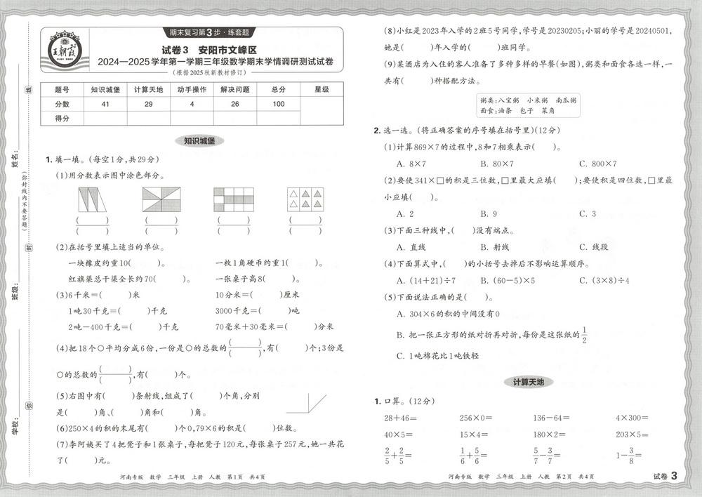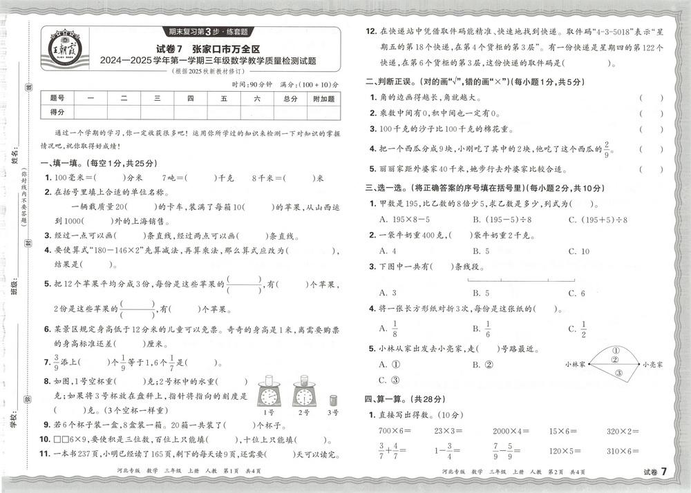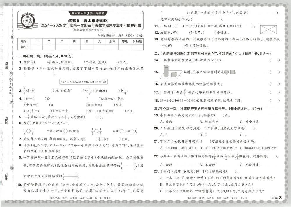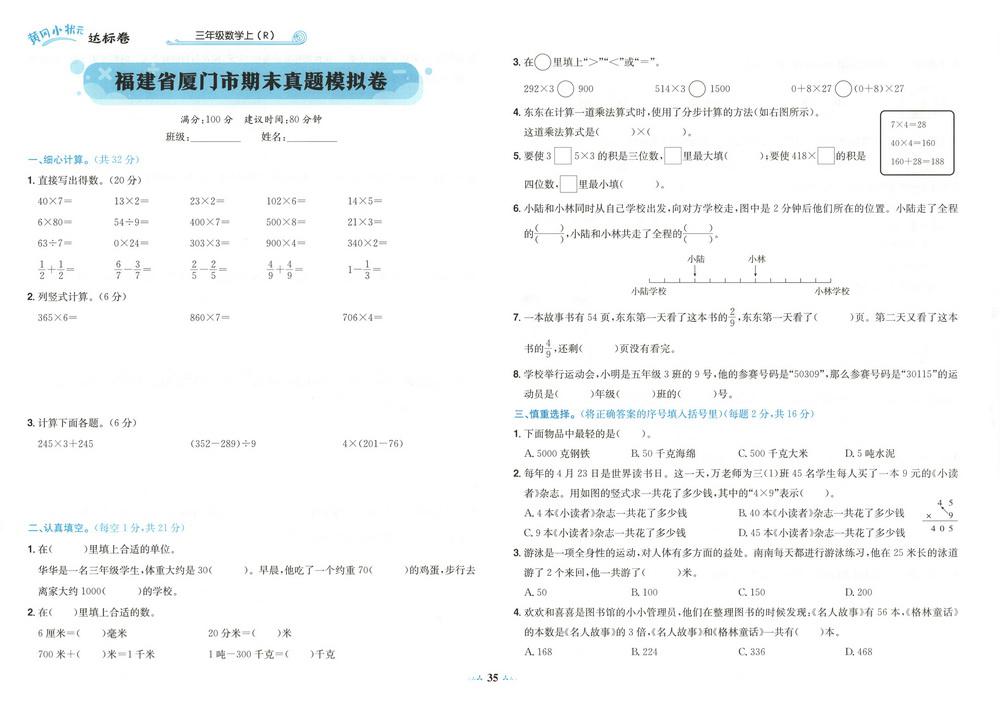 新教材人教版三年级上册数学全国省市各地期末真题试卷二十八video