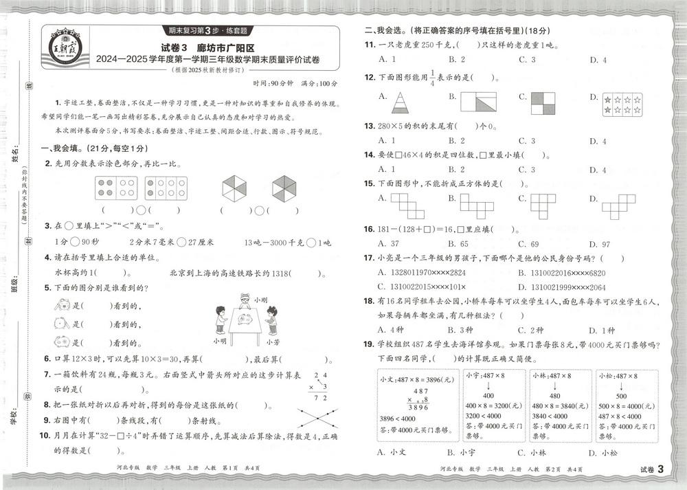 新教材人教版三年级上册数学全国省市各地期末真题试卷二十一video