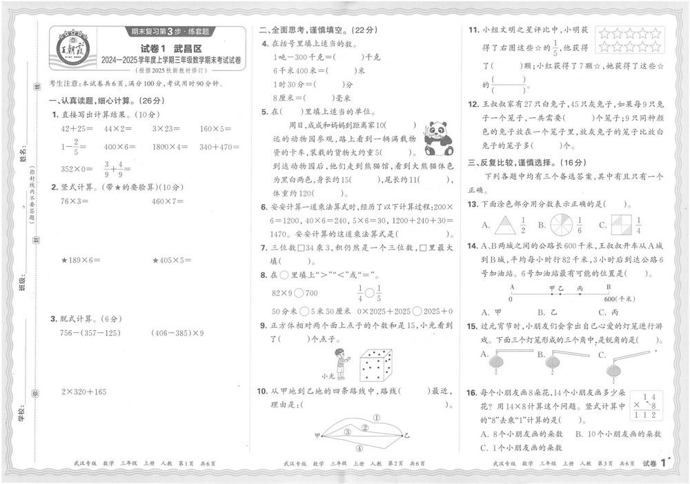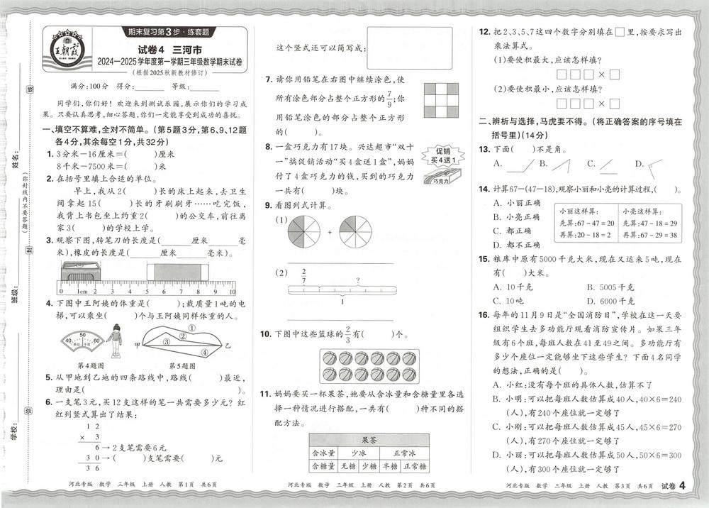 新教材人教版三年级上册数学全国省市各地期末真题试卷十六video