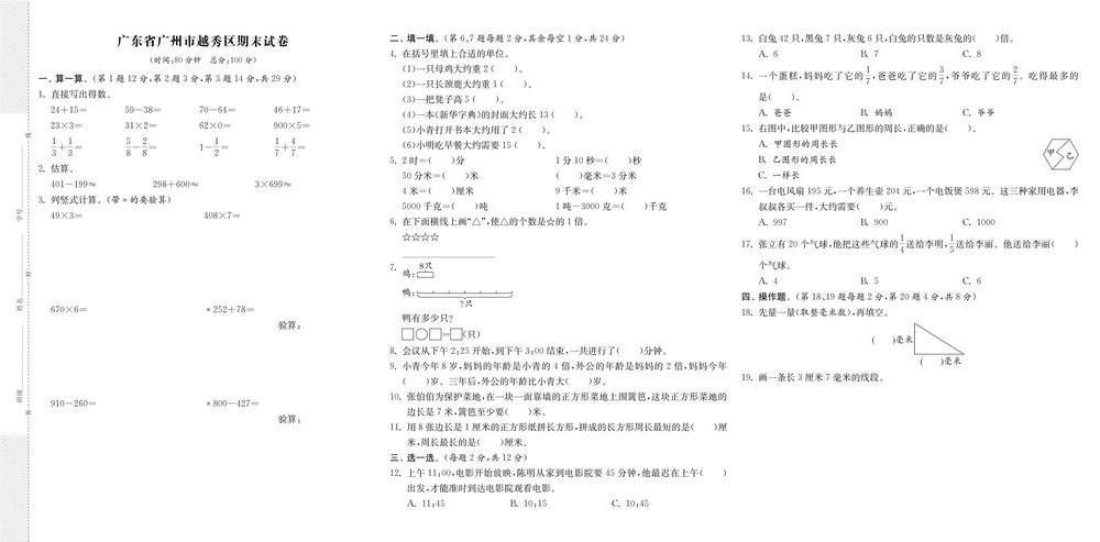 新教材人教版三年级上册数学全国省市各地期末真题试卷四十九