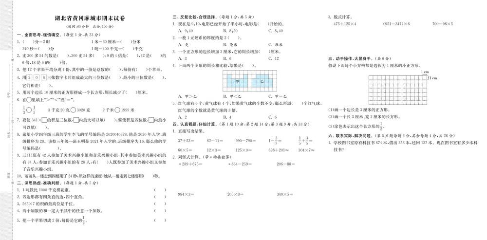 新教材人教版三年级上册数学全国省市各地期末真题试卷五十