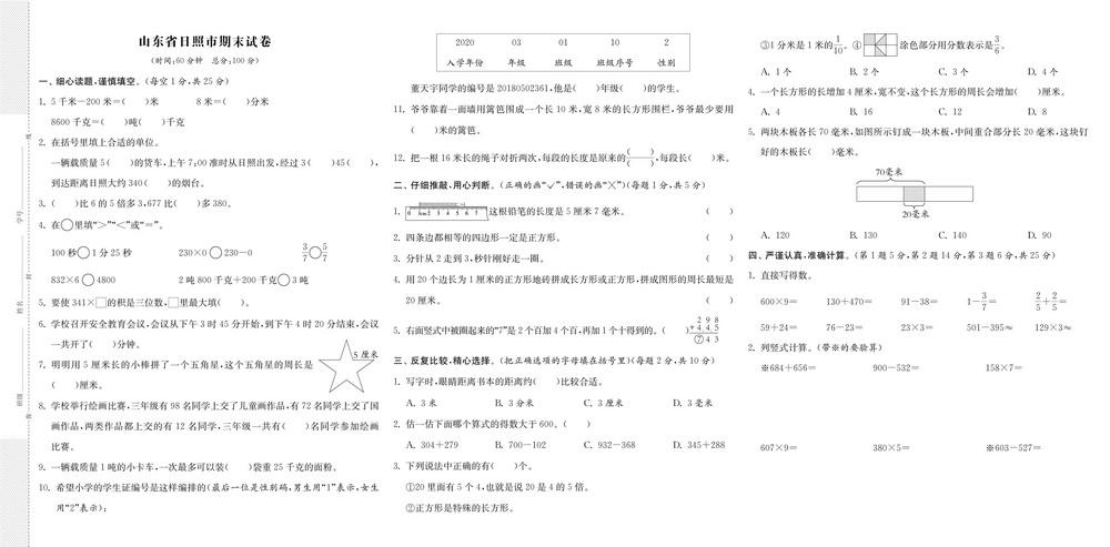 新教材人教版三年级上册数学全国省市各地期末真题试卷五十二