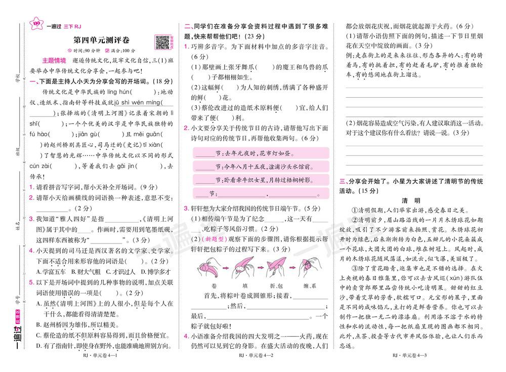 新教材人教版三年级下册语文第四单元测试卷一video