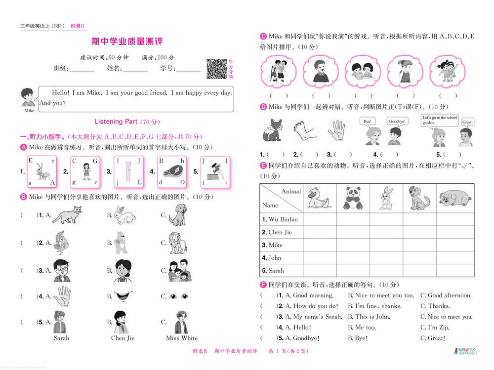 新教材人教PEP版三年级上册英语期中测试卷二十二