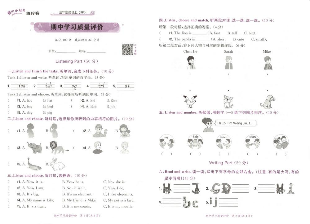 新教材人教PEP版三年级上册英语期中测试卷二十三