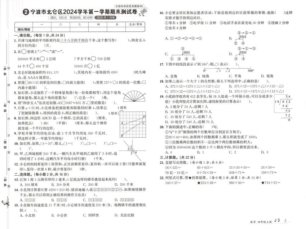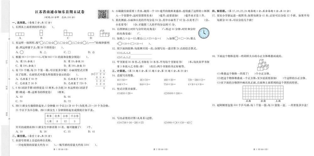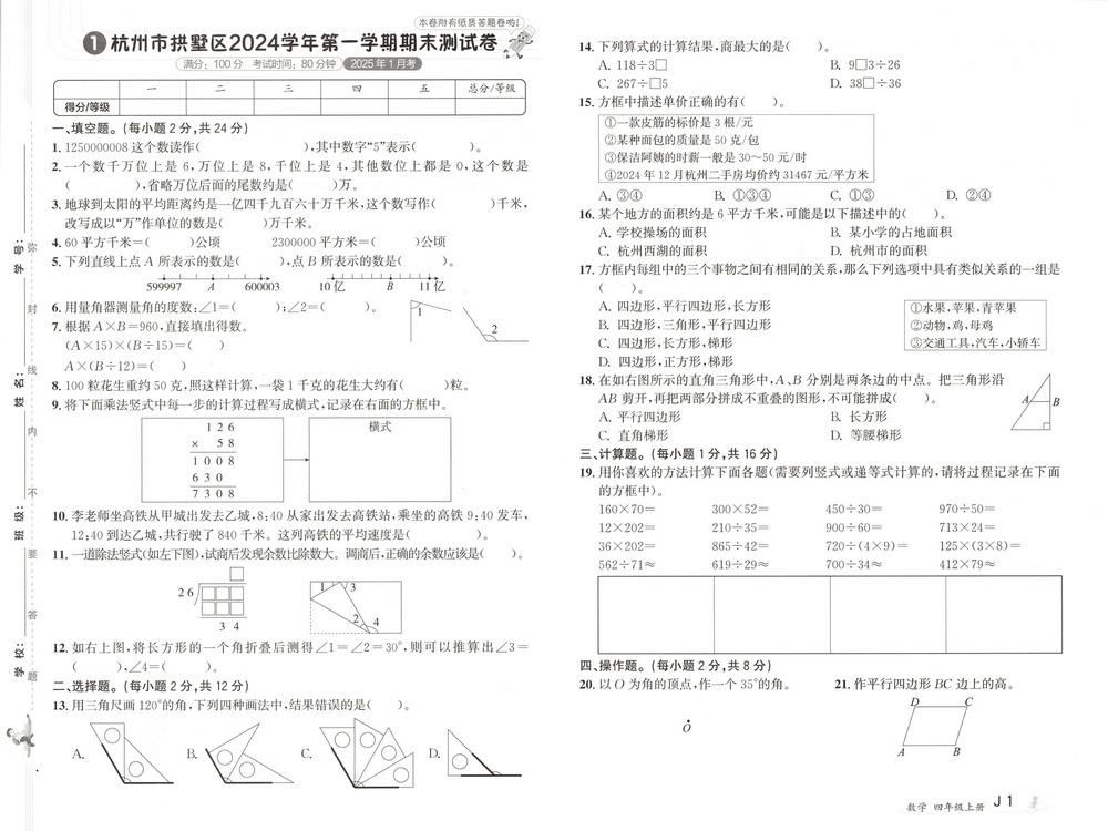 人教版四年级上册数学全国省市各地期末真题试卷四十video