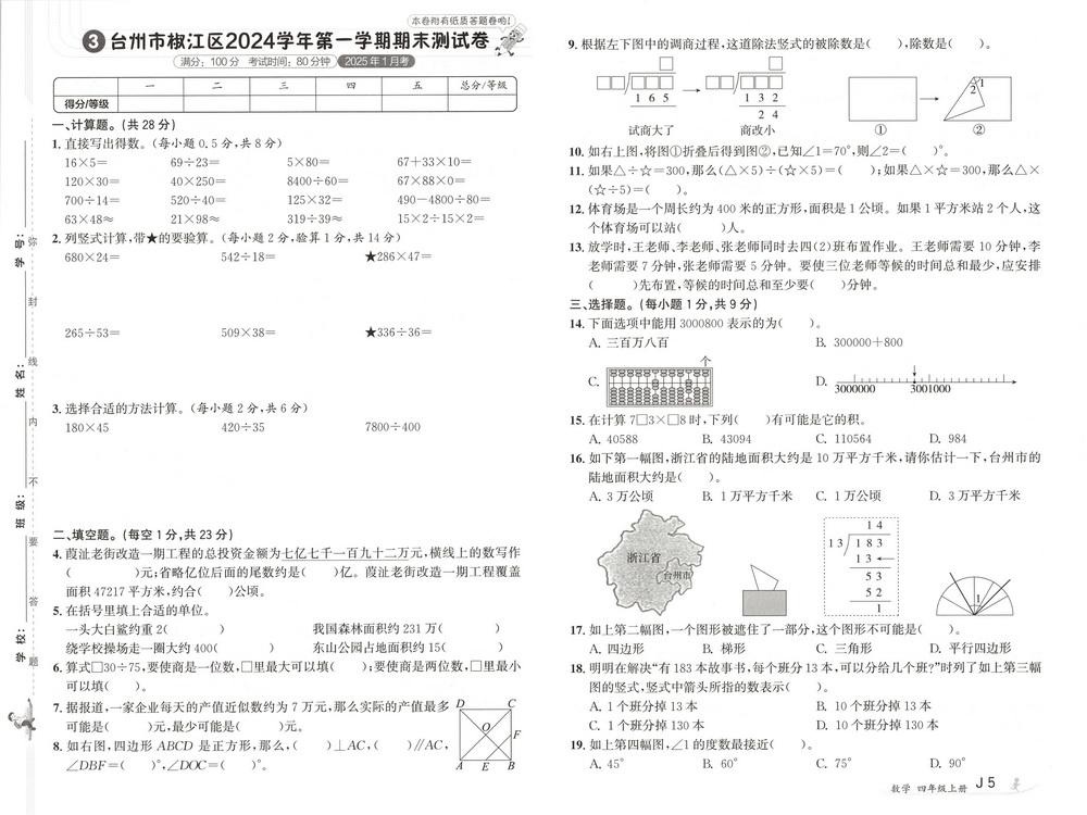 人教版四年级上册数学全国省市各地期末真题试卷二十八video