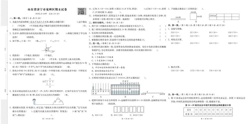 人教版四年级上册数学全国省市各地期末真题试卷三十六