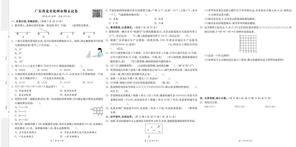人教版四年级上册数学全国省市各地期末真题试卷三十九