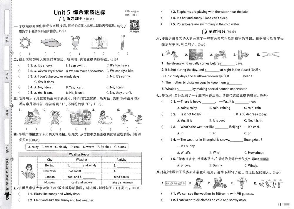 新教材人教PEP版四年级上册英语unit5测试卷一