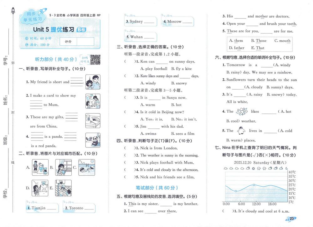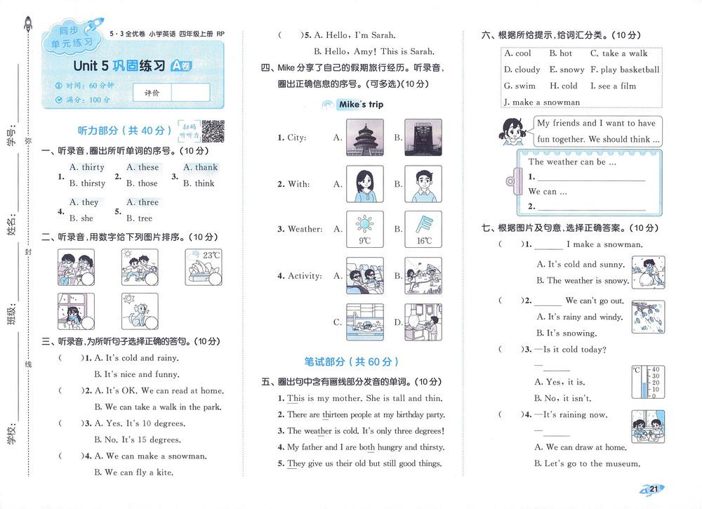 新教材人教PEP版四年级上册英语unit5测试卷五video