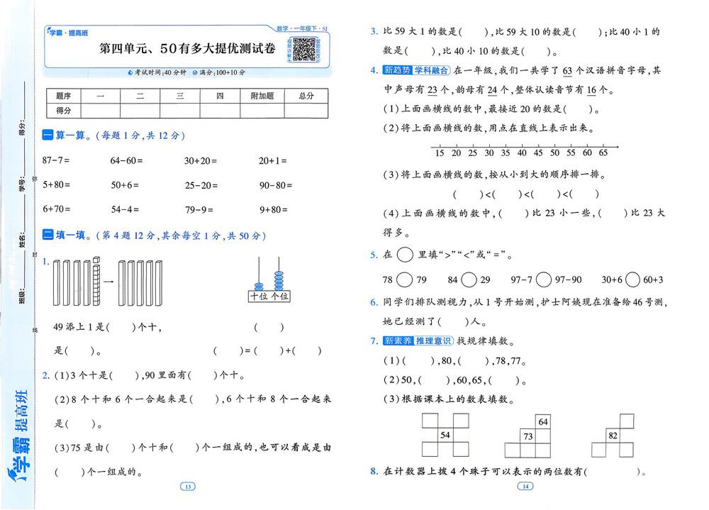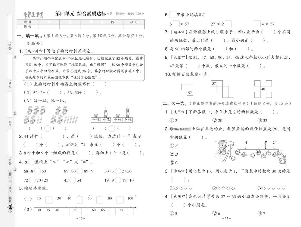新教材苏教版一年级下册数学第四单元测试卷十四video