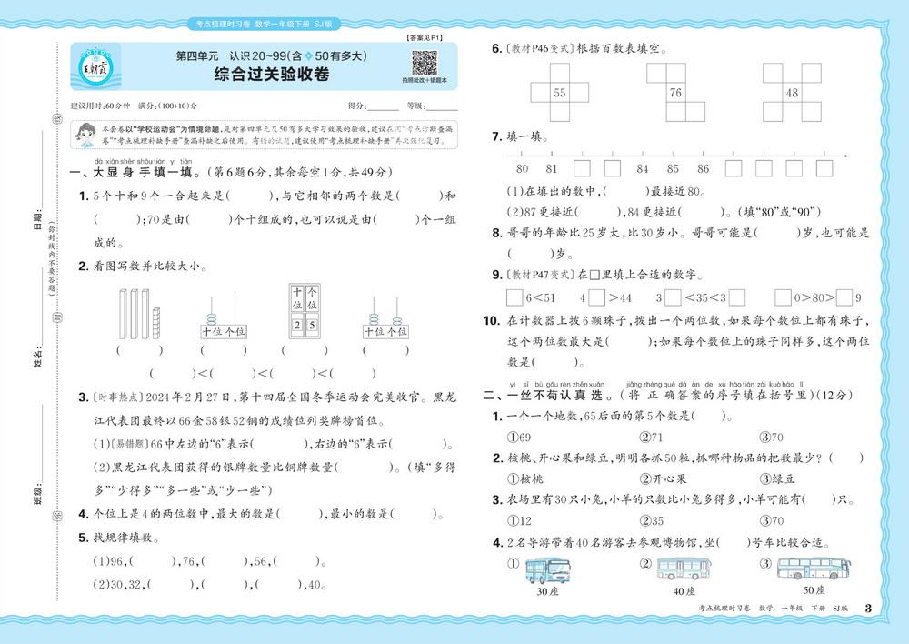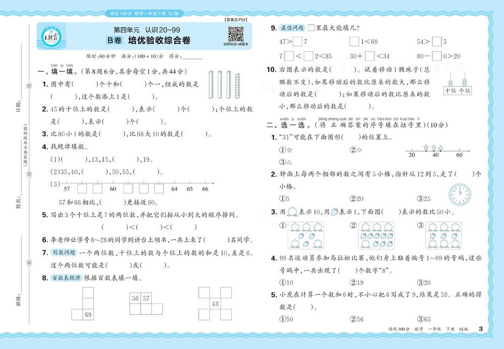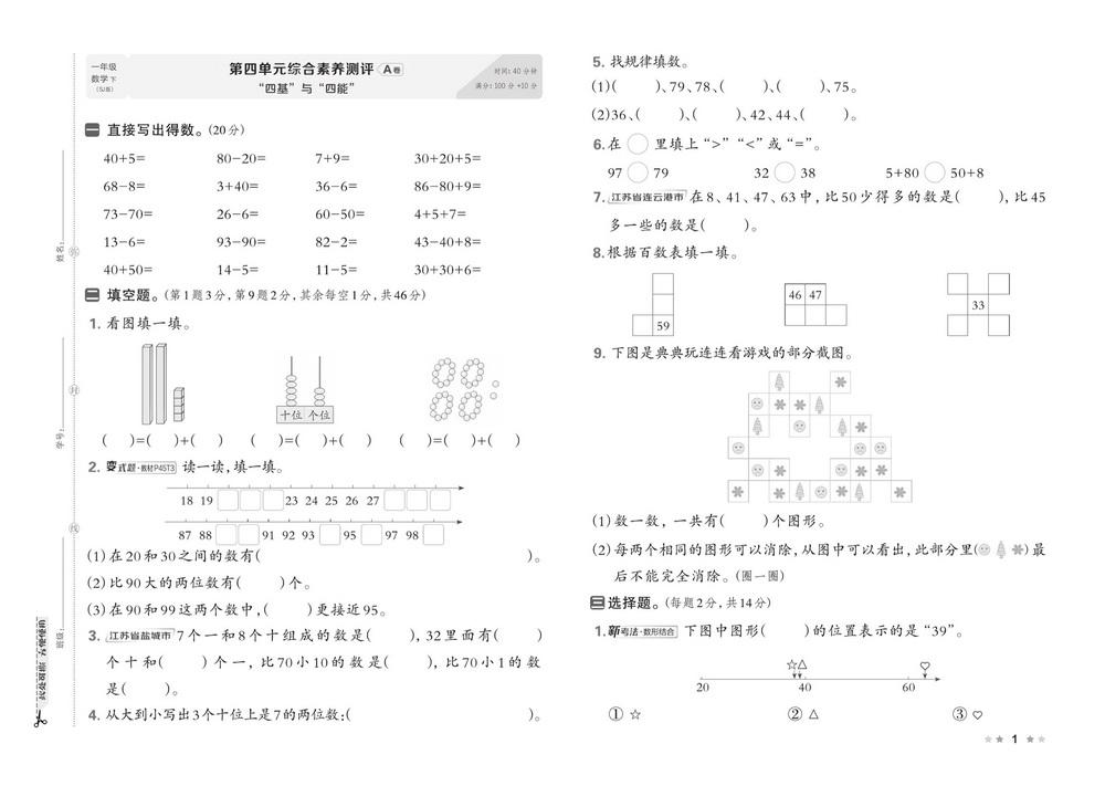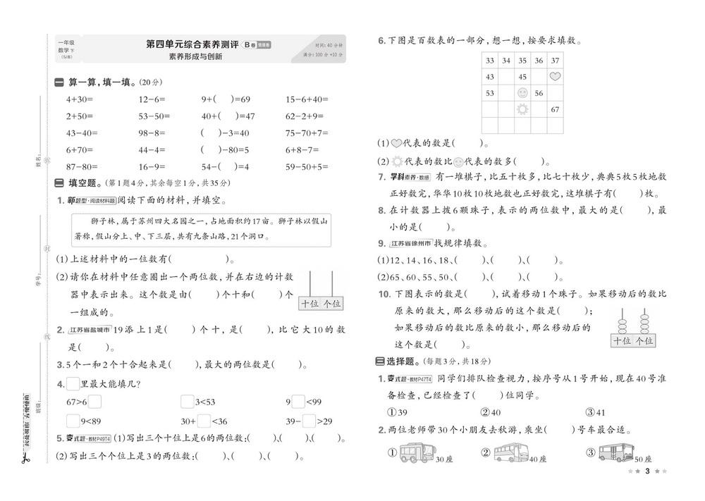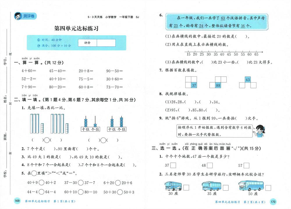新教材苏教版一年级下册数学第四单元测试卷十video