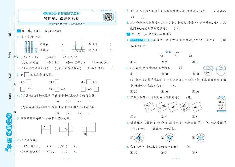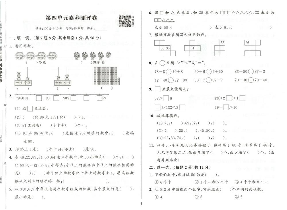 新教材苏教版一年级下册数学第四单元测试卷七video