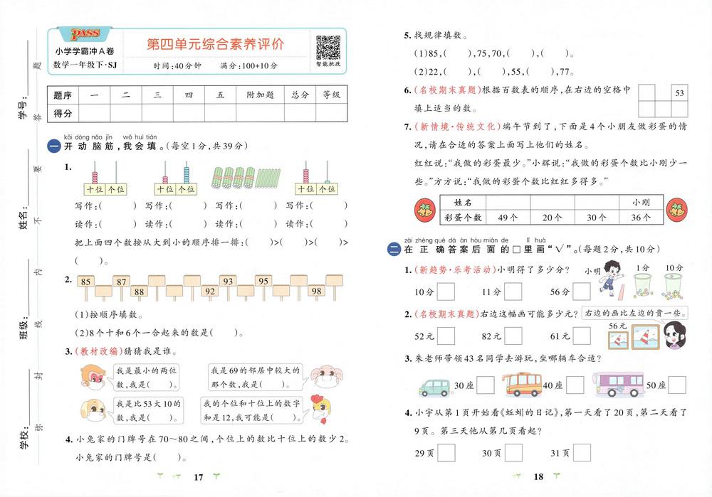 新教材苏教版一年级下册数学第四单元测试卷十八video