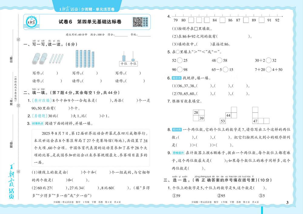新教材苏教版一年级下册数学第四单元测试卷六video