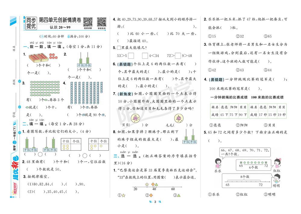 新教材苏教版一年级下册数学第四单元测试卷三video