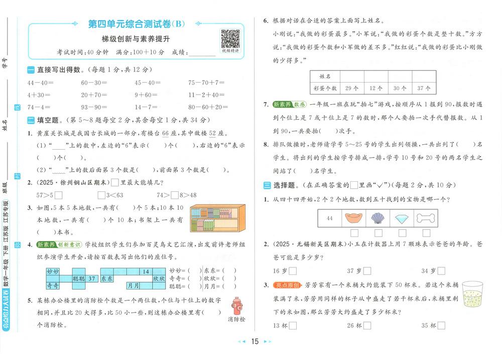 新教材苏教版一年级下册数学第四单元测试卷十三