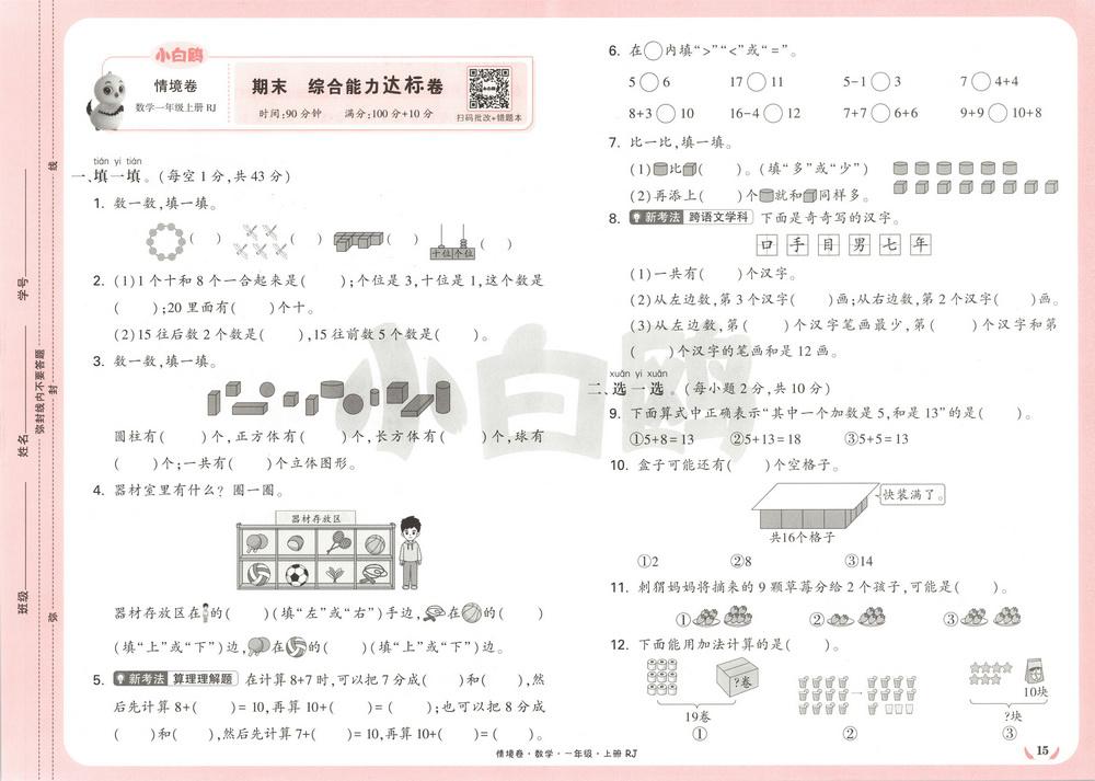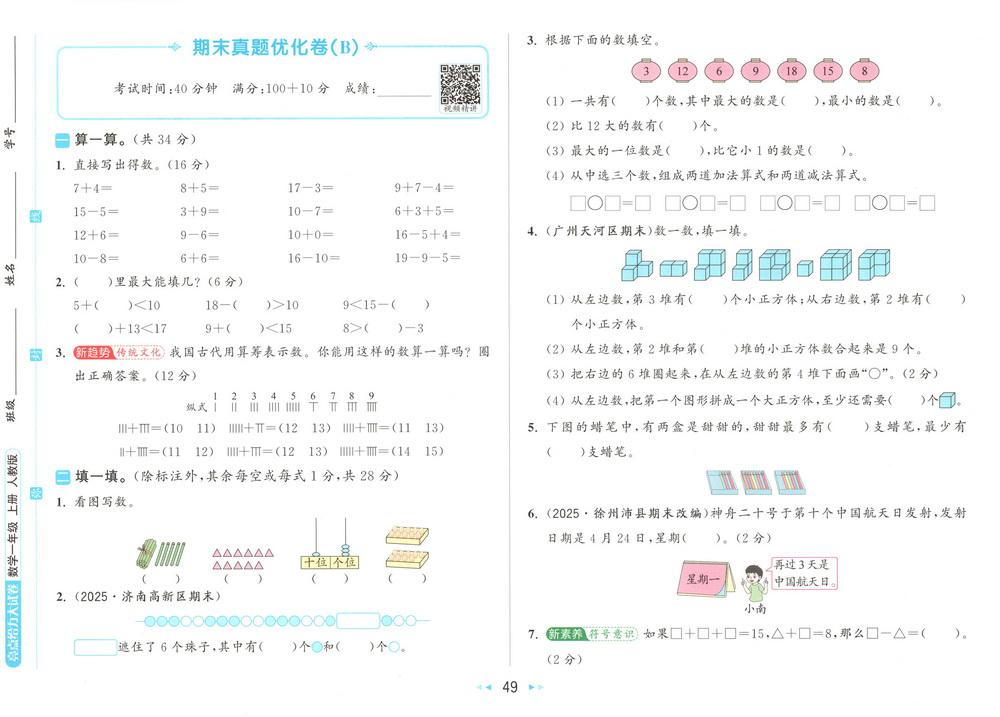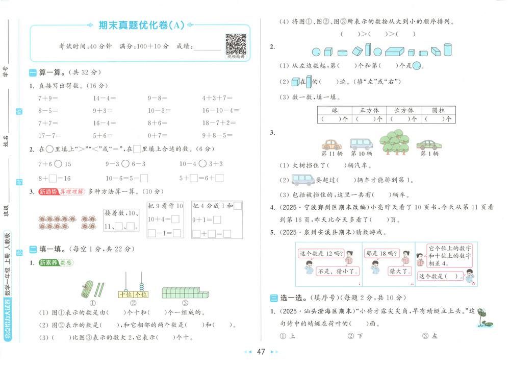 新教材人教版一年级上册数学期末测试卷五十四video