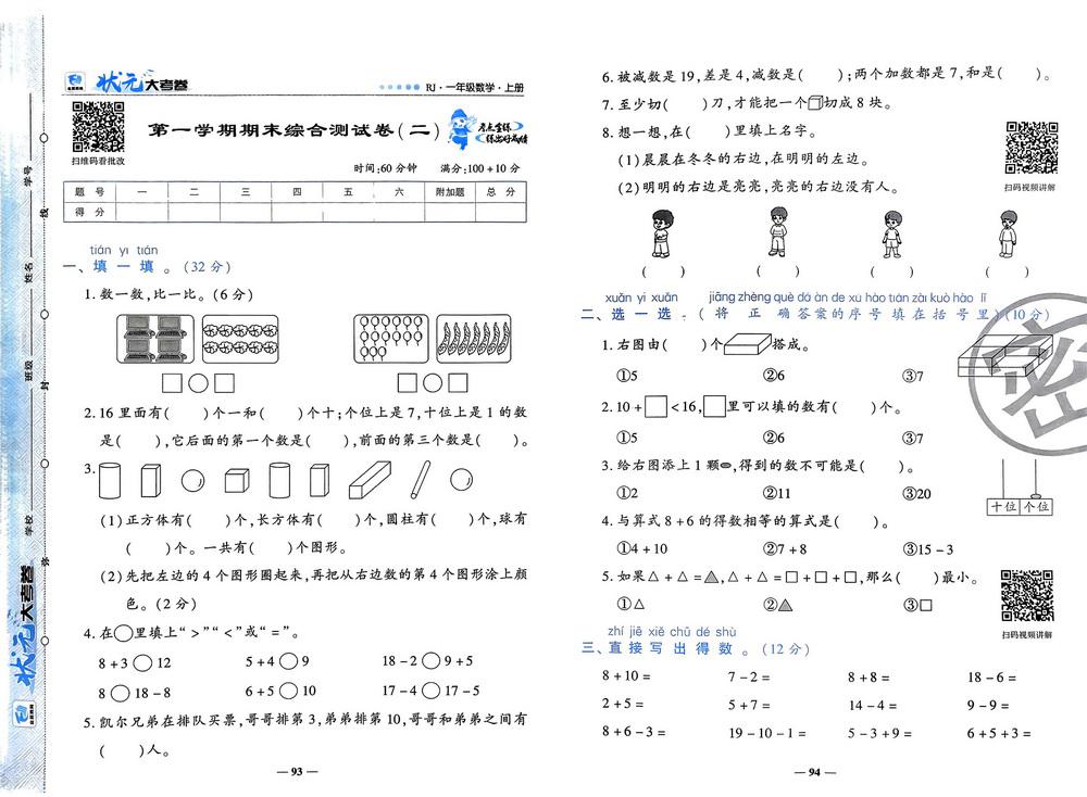 新教材人教版一年级上册数学期末测试卷六十三video