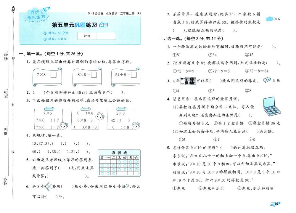 新教材人教版二年级数学上册第五单元测试卷十