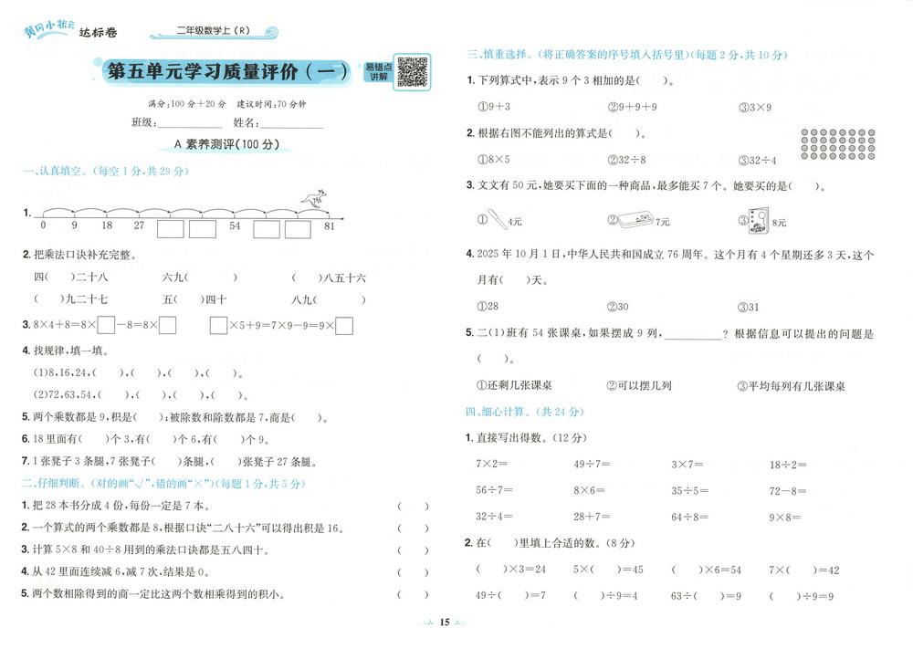 新教材人教版二年级数学上册第五单元测试卷二十一