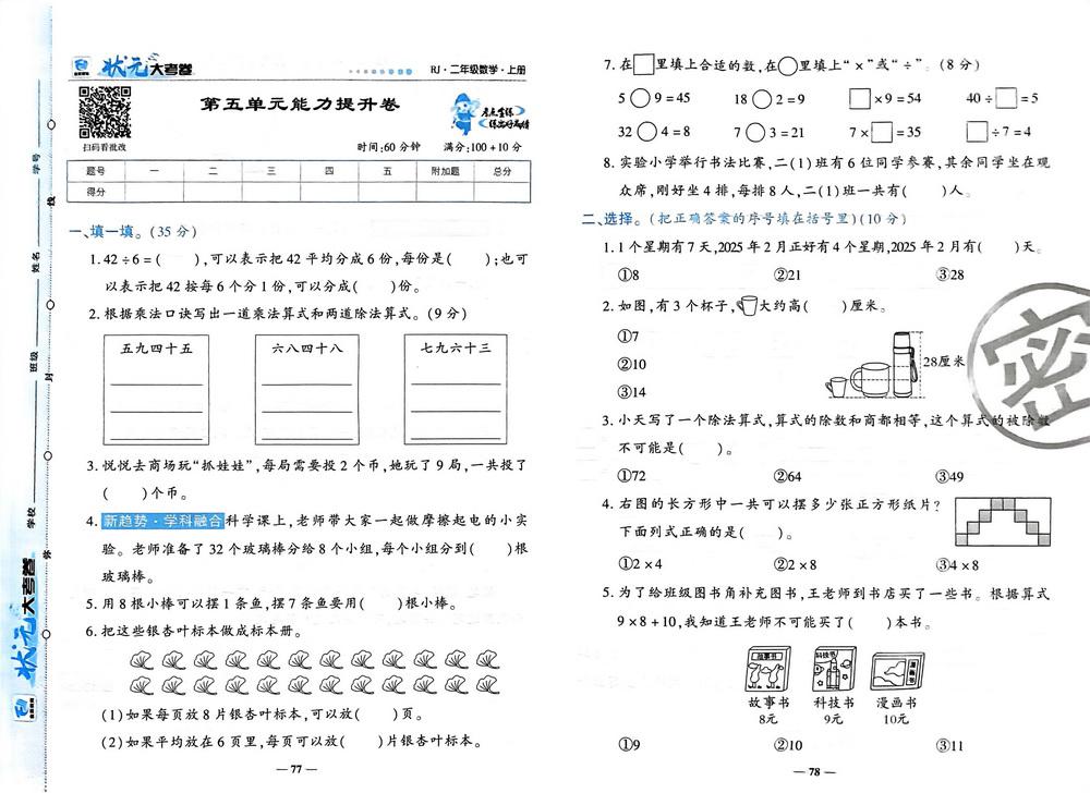 新教材人教版二年级数学上册第五单元测试卷二十五