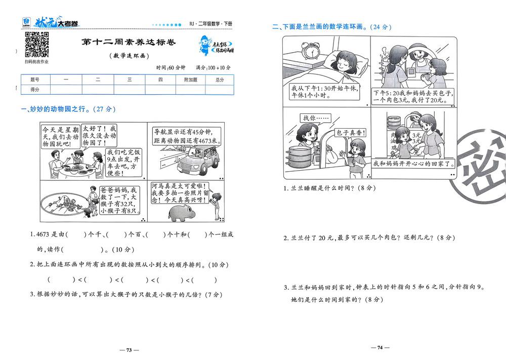 新教材人教版二年级数学下册《数学连环画》测试卷四