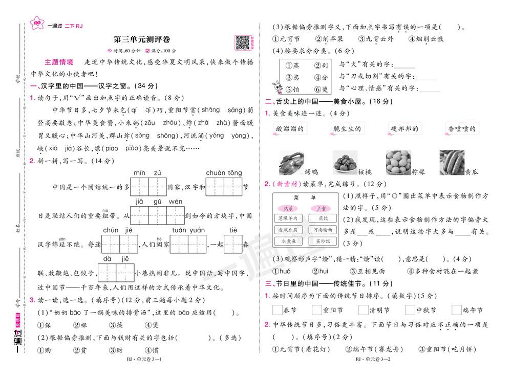 新教材人教版二年级语文下册第三单元测试卷七