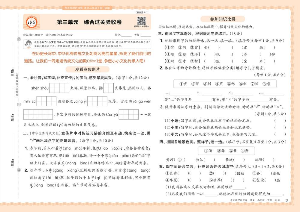 新教材人教版二年级语文下册第三单元测试卷十