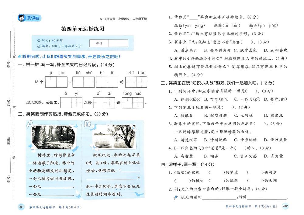 新教材人教版二年级语文下学期第四单元测试卷十五