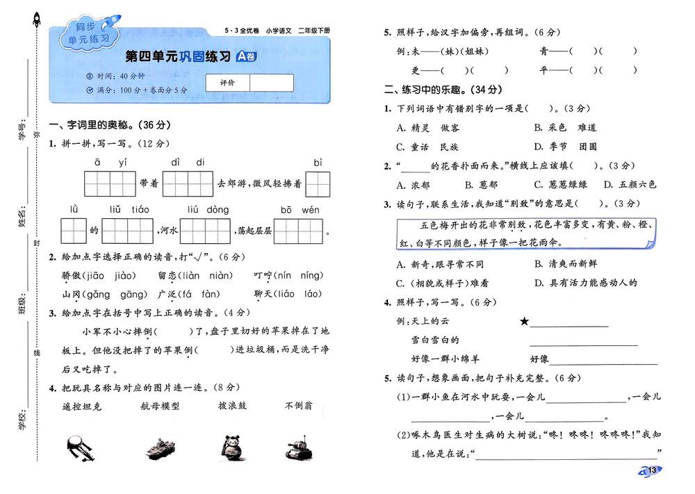 新教材人教版二年级语文下学期第四单元测试卷十六