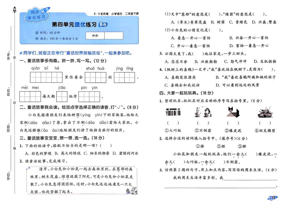 新教材人教版二年级语文下学期第四单元测试卷十七