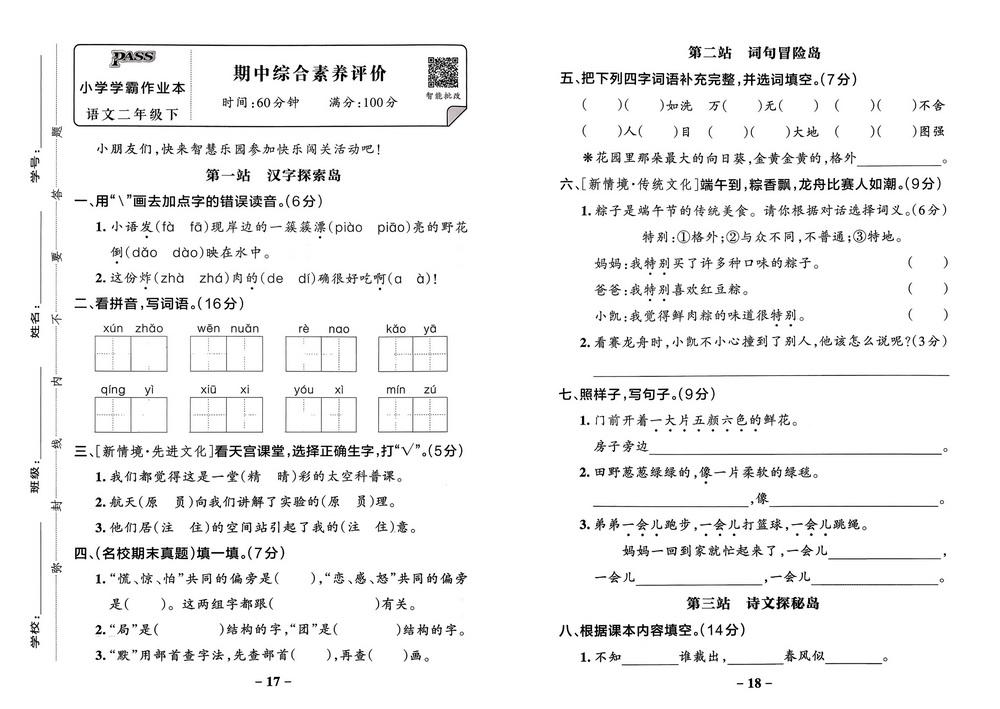 新教材人教版二年级语文下学期期中测试卷十